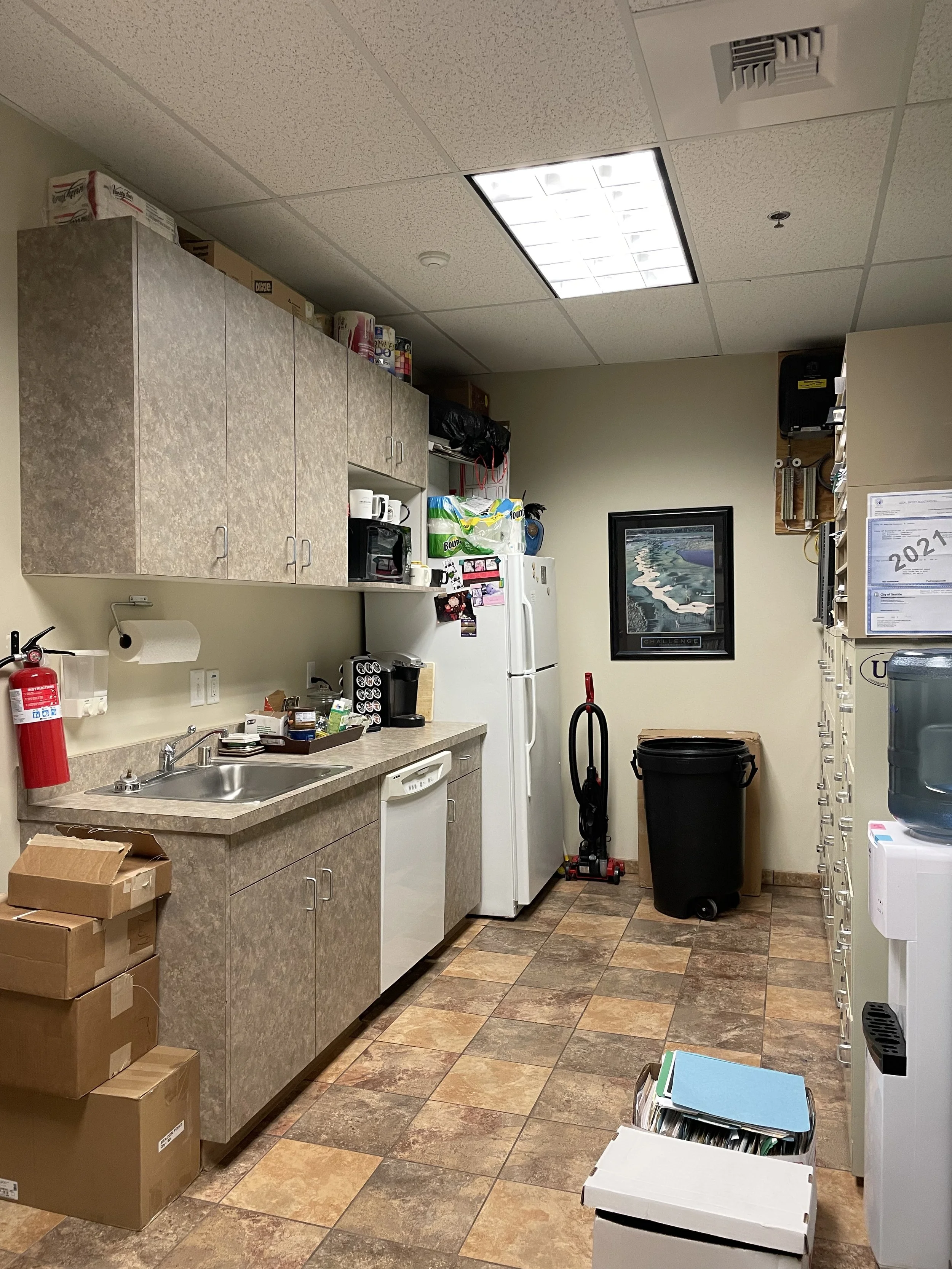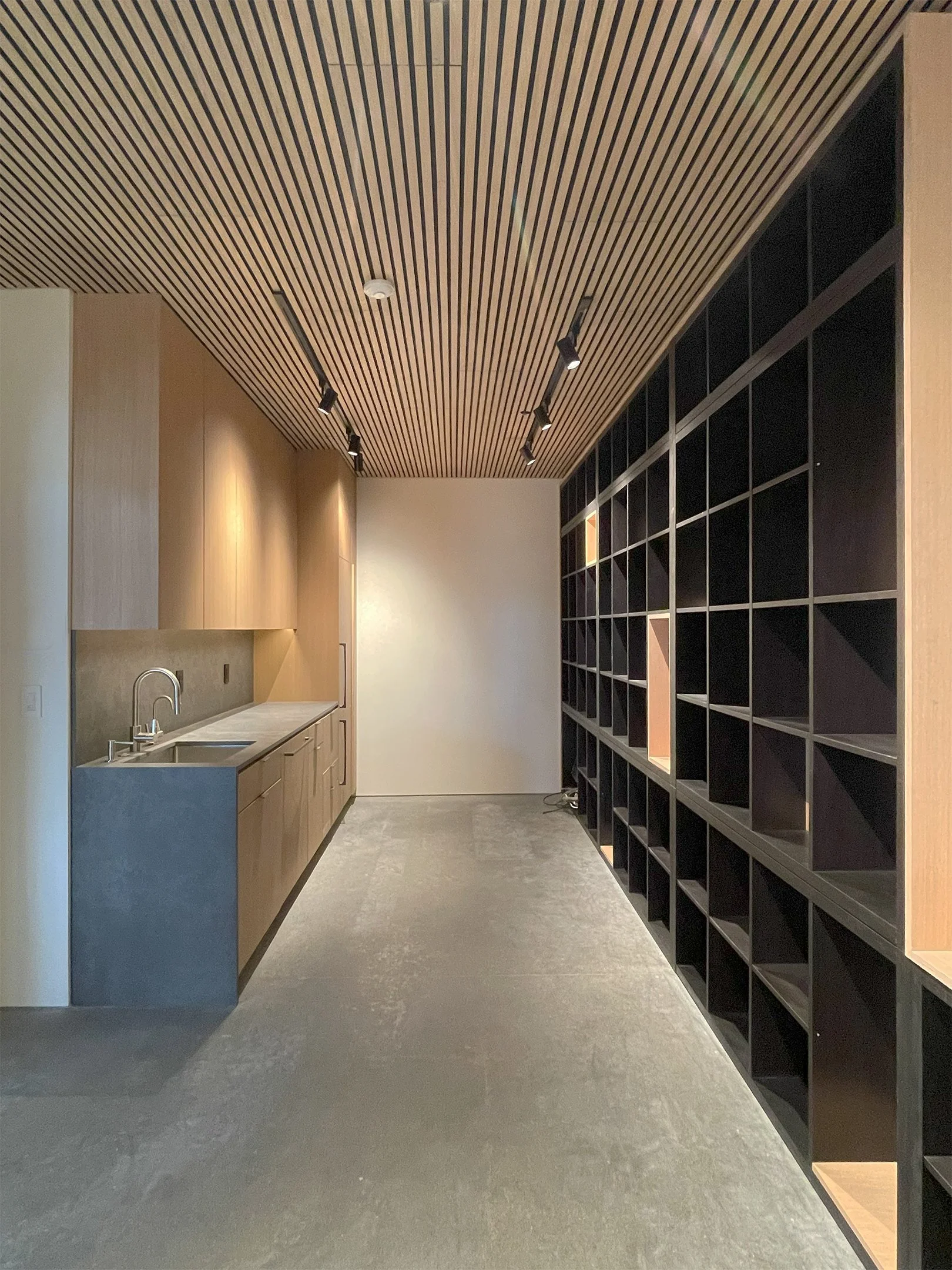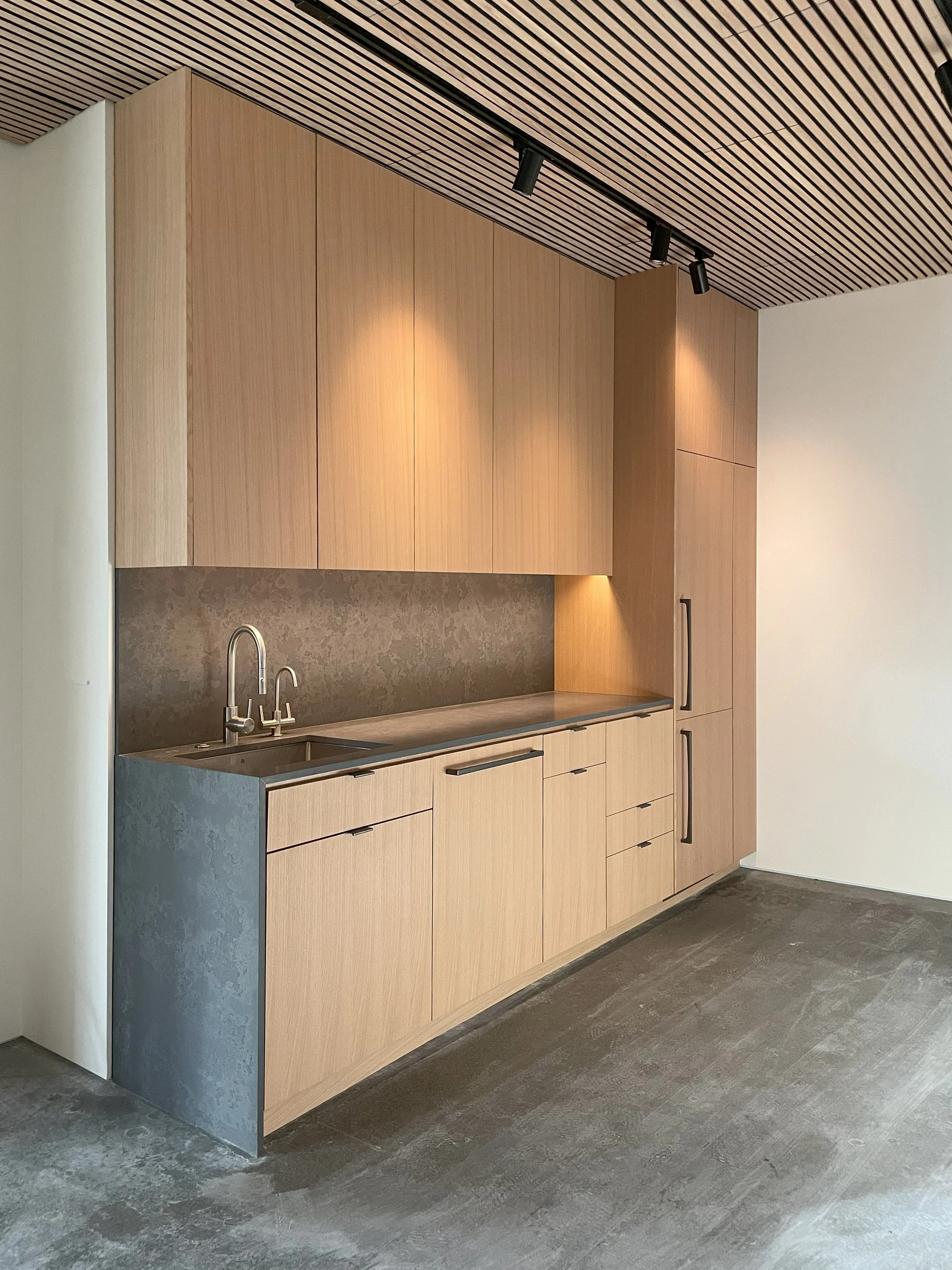 The conference room is designed for productive meetings, featuring white oak acoustic ceiling panels and a glass wall that enhances the perceived size of the space. The serene and relaxing atmosphere of the dark bathroom adds to the overall ambiance. Additionally, we have access to a rooftop deck, providing an opportunity to enjoy the view of Lake Union and Space Needle on sunny days.
